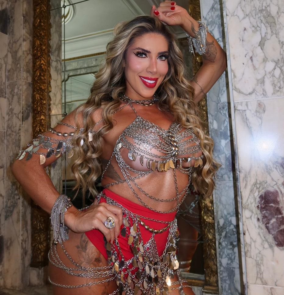 Para a ocasião, a musa apostou em um visual impactante, com look elaborado em correntes prateadas, reforçando o brilho, a personalidade e a presença marcante que já se tornaram sua assinatura nos ensaios da tricolor de Duque de Caxias.
